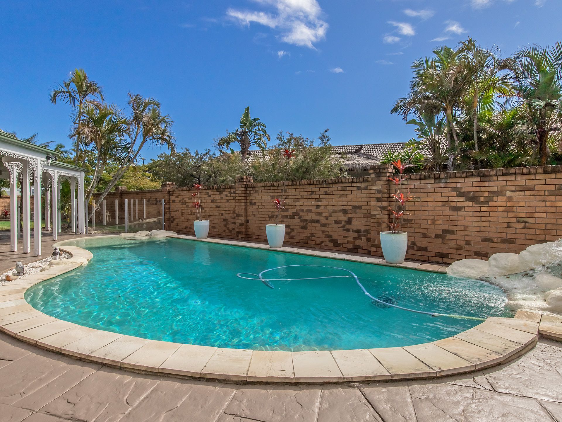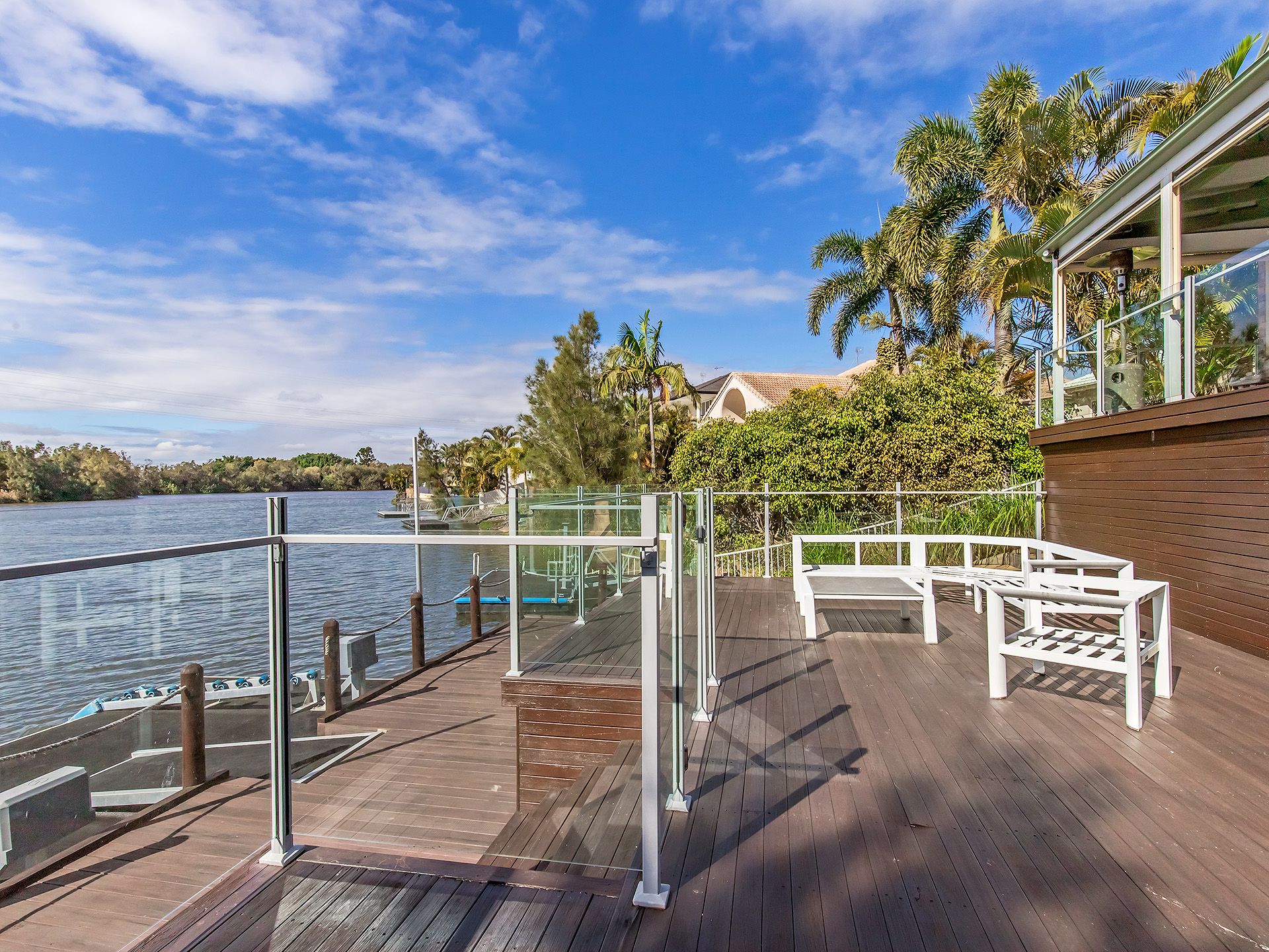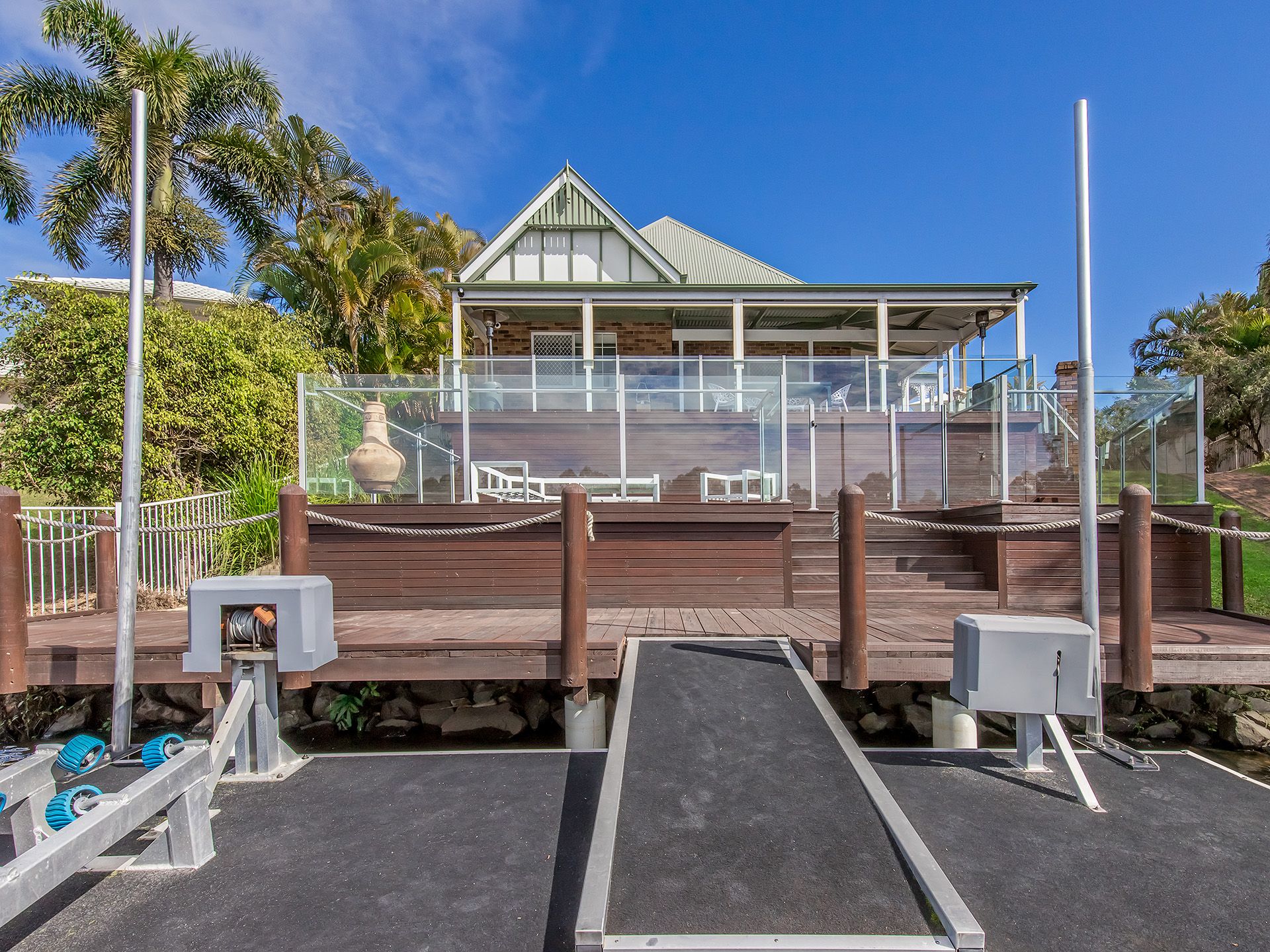 Upon walking outside to your own slice of paradise you will find a sparkling in-ground salt water pool and prestigious waterfront views with your own pontoon complete with 2 electric winches and a roller ramp for small boats and jet ski.